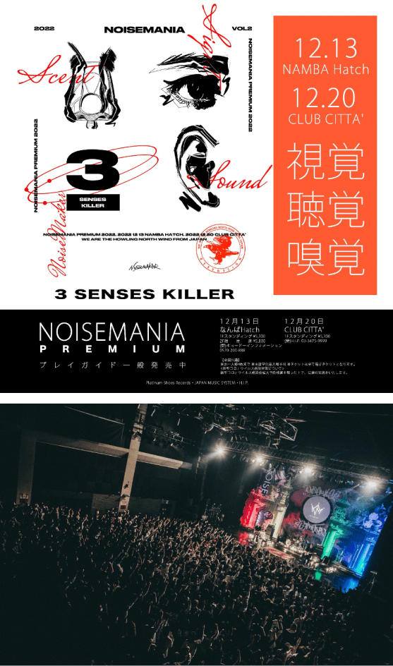 「NOISEMANIA PREMIUM 2022」を大阪、神奈川の2箇所で開催。『3 SENSES KILLER』、視覚・聴覚・嗅覚をフル活用するライブスタイルで感覚をハックすることをコンセプトにスペシャルゲストとしてゴスペルチーム「Heaven’s choir」やドラムラインチーム「鼓和-core-」が参加。迫力ある演出やNOISEMAKERの歌声、演奏はまさしく1つの作品であり、見るものの感覚をハックされた唯一無二のショーとなった。